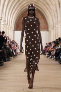 Nowe spojrzenie na wzór w groszki oferuje także Lanvin, który zdobi lekką, półtransparentną sukienkę maxi, subtelnie nawiązując do klimatu boho. Odkryj te nowoczesne interpretacje wzoru w groszki od Balmain, Lanvin, Marni i więcej.
